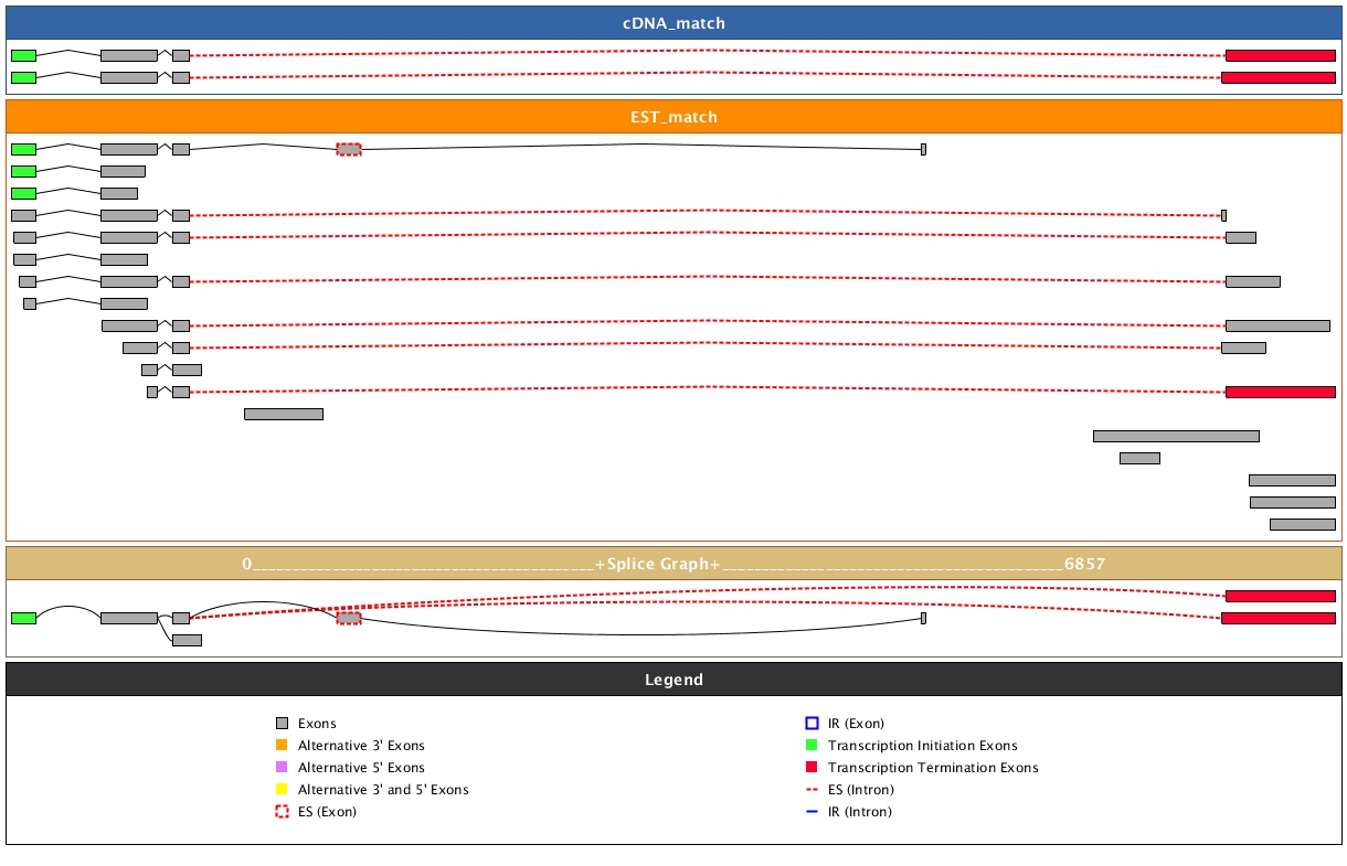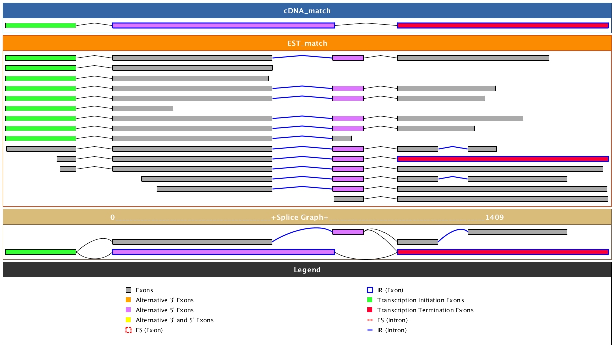 | AS Cluster | Splice Graph | # ESTs | # FL cDNA | # Exons | IR | SE | 3' | 5' | B |