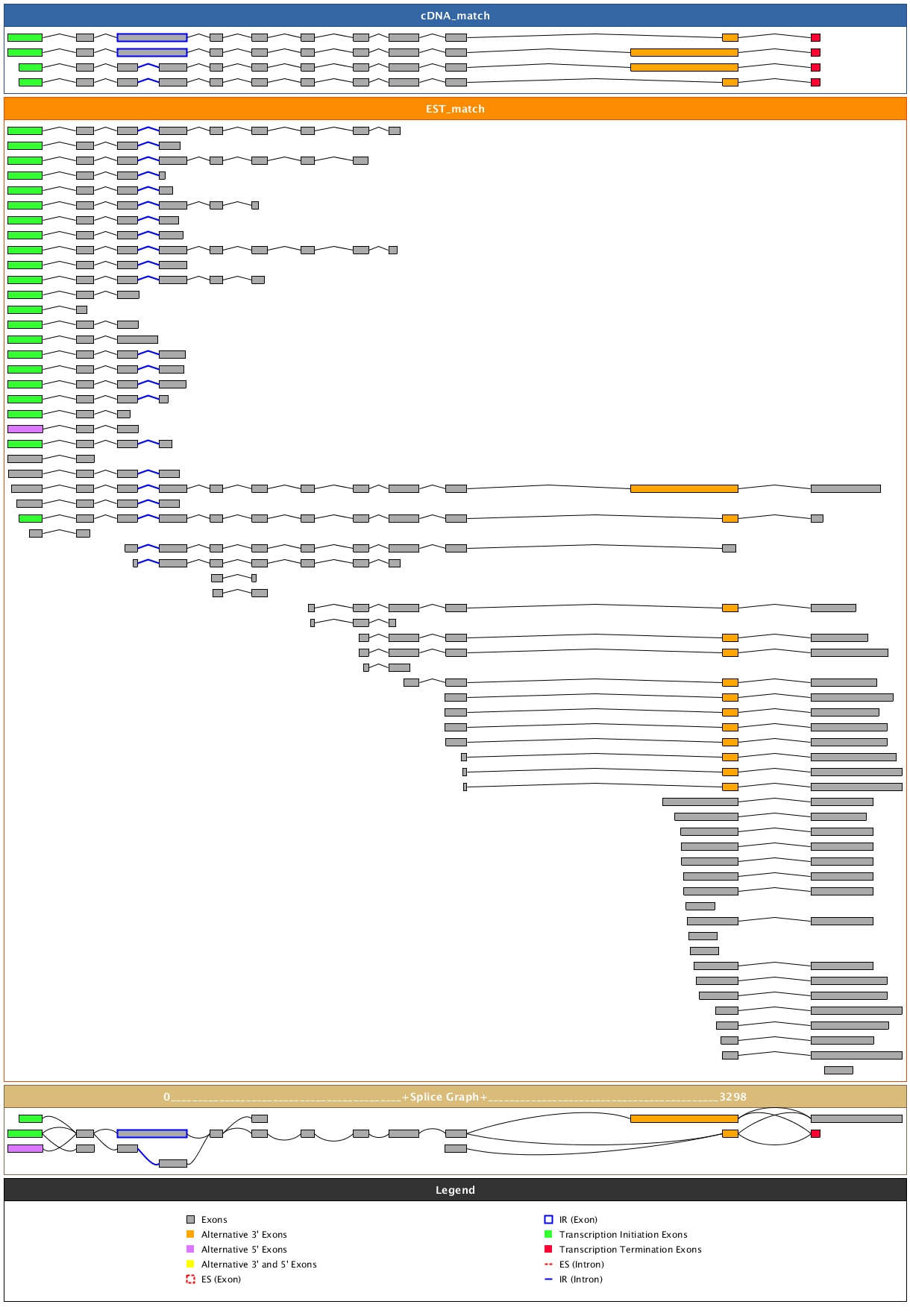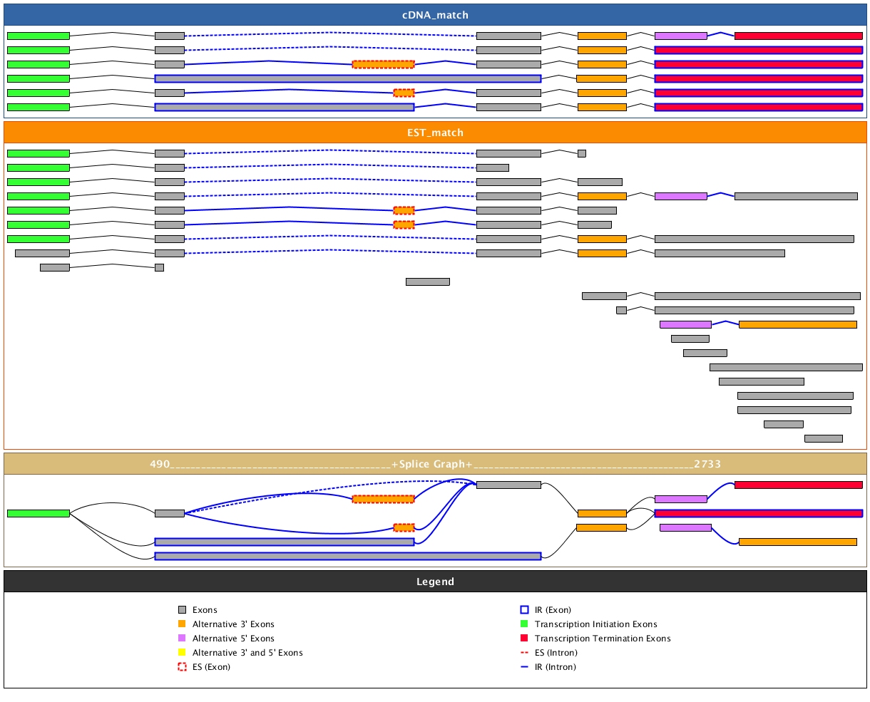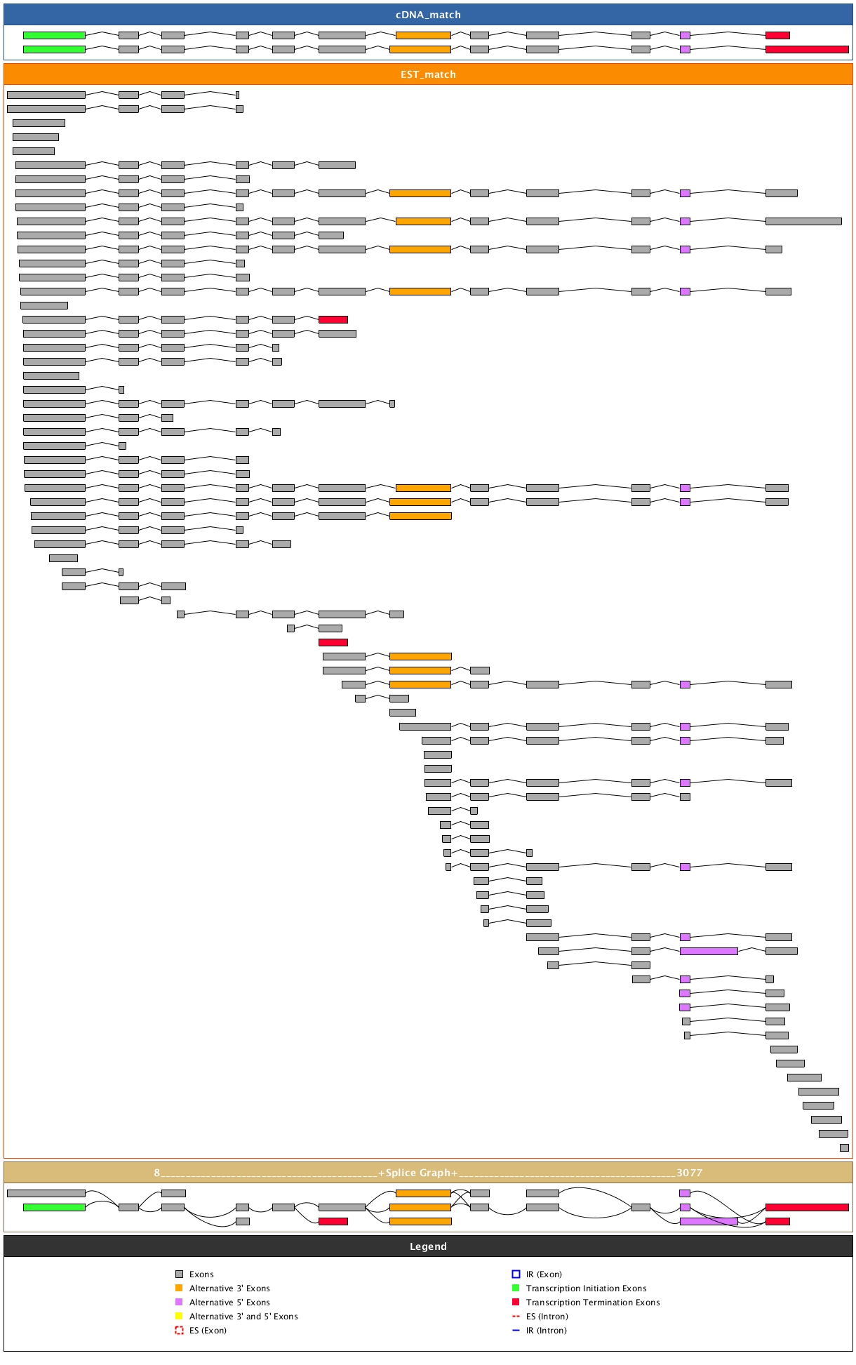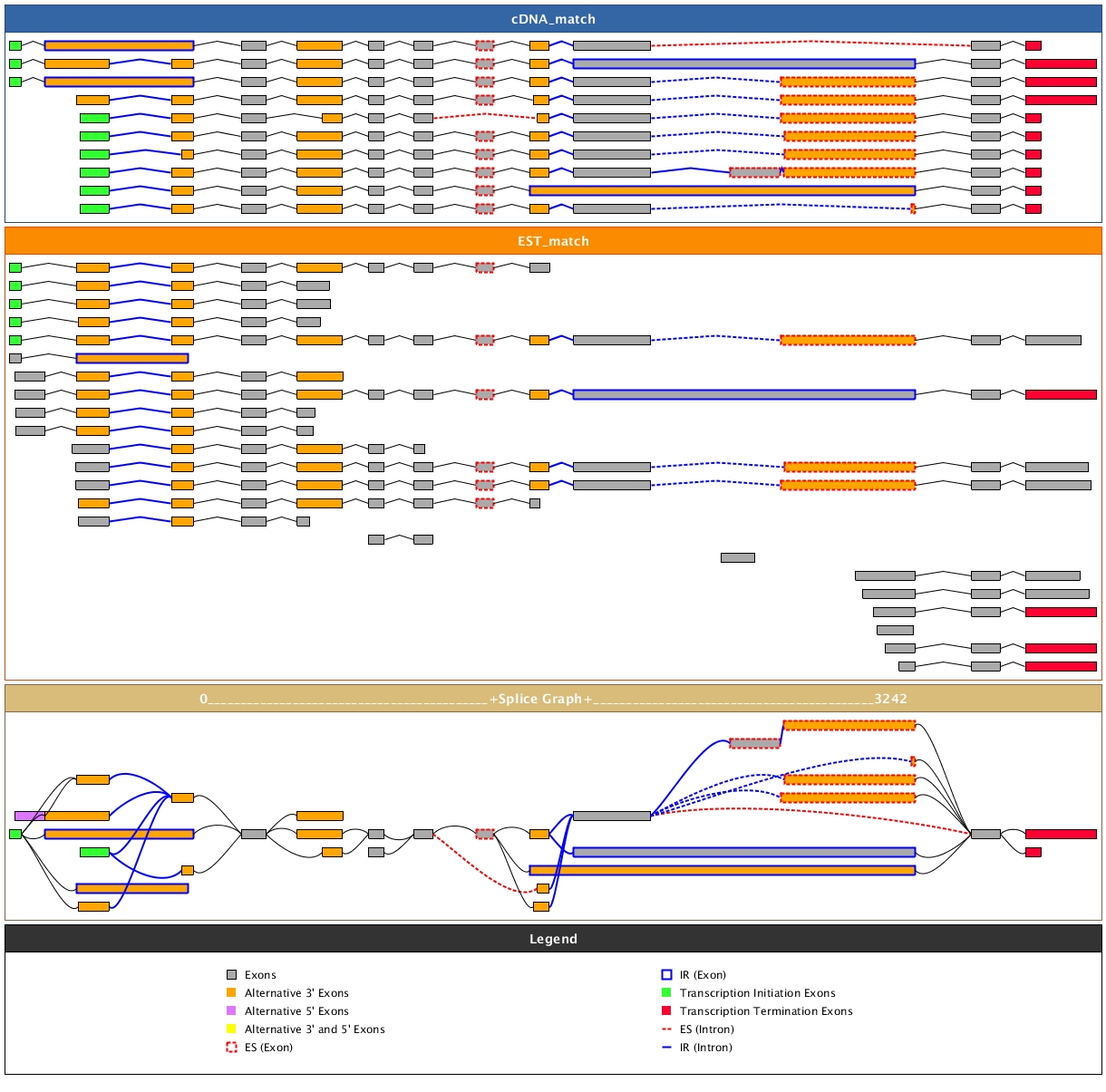 | AS Cluster | Splice Graph | # ESTs | # FL cDNA | # Exons | IR | SE | 3' | 5' | B |