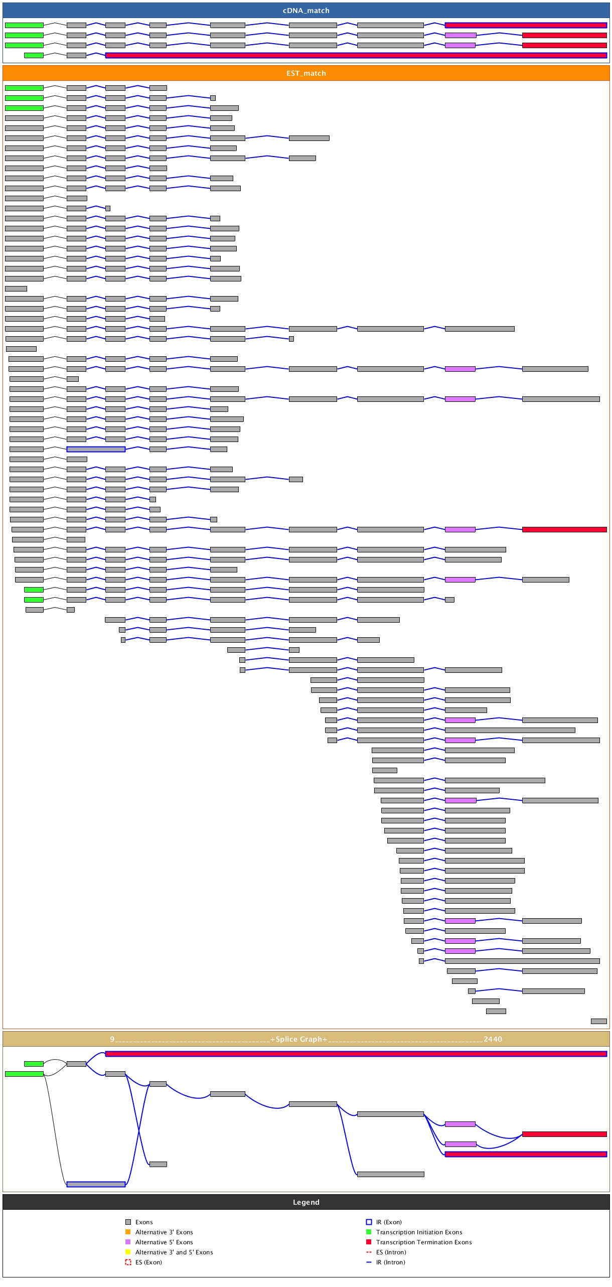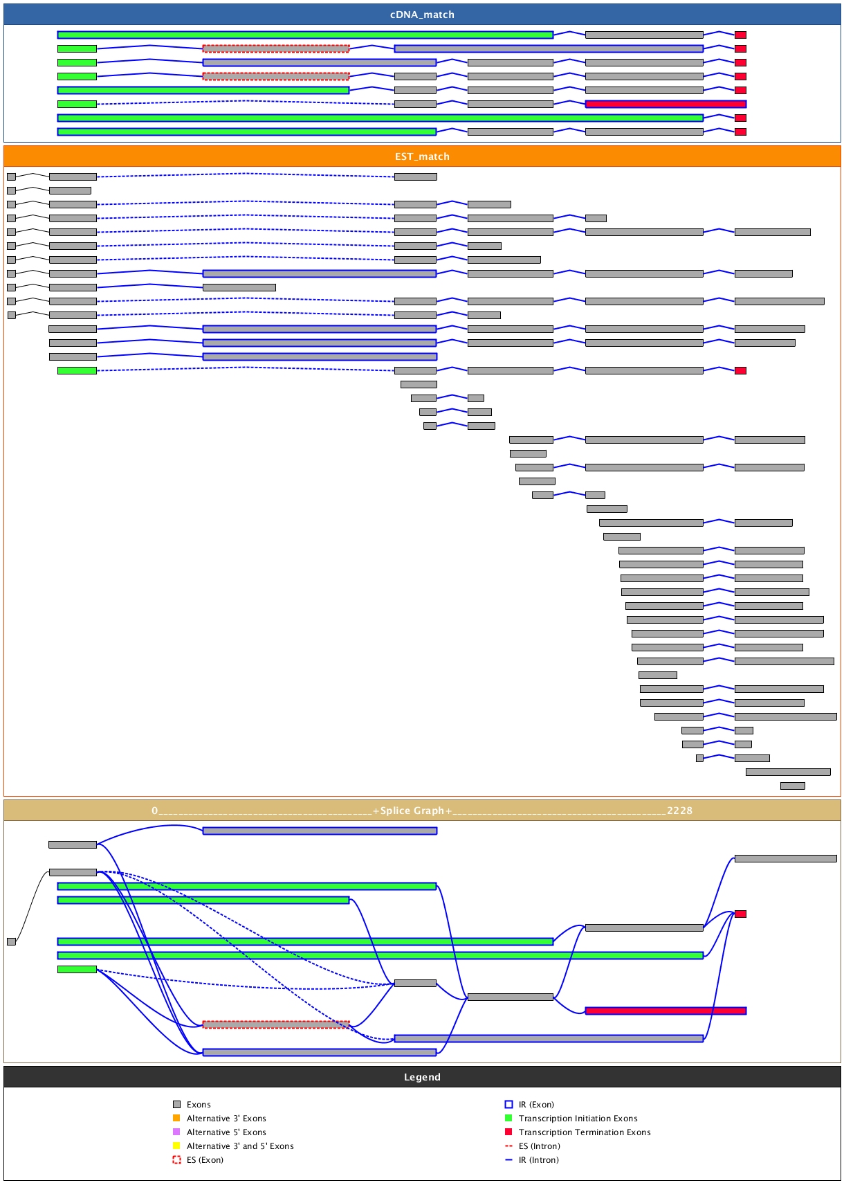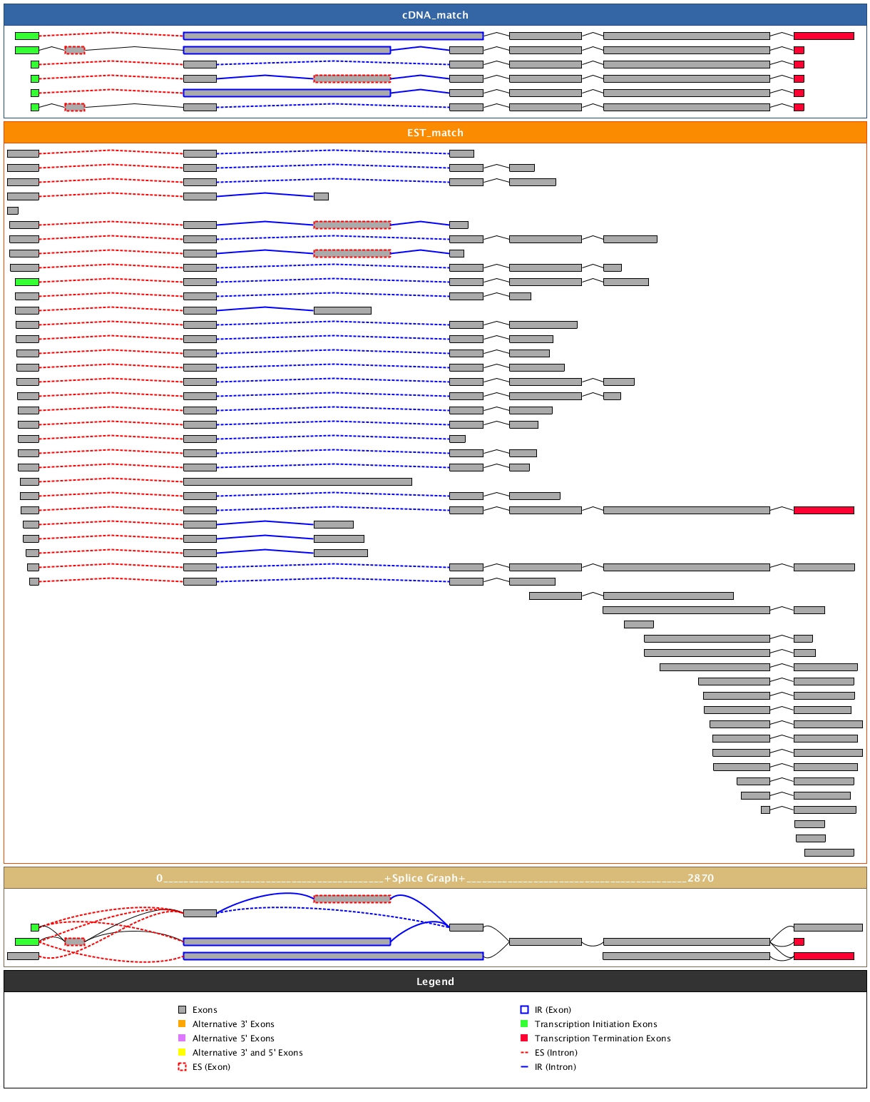 | AS Cluster | Splice Graph | # ESTs | # FL cDNA | # Exons | IR | SE | 3' | 5' | B |