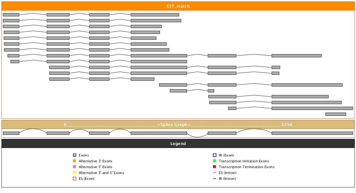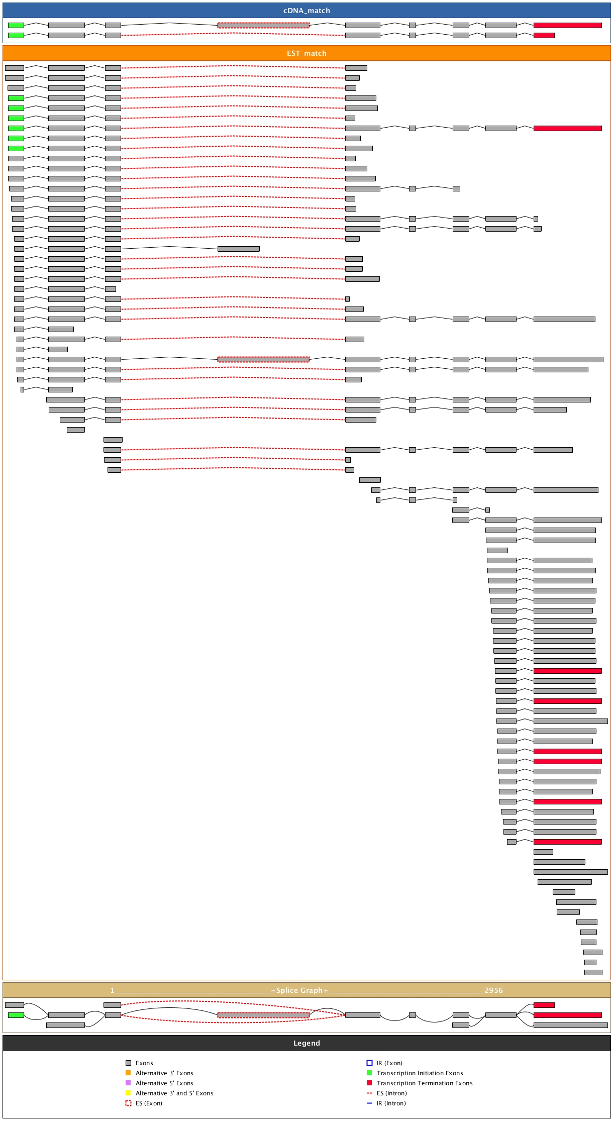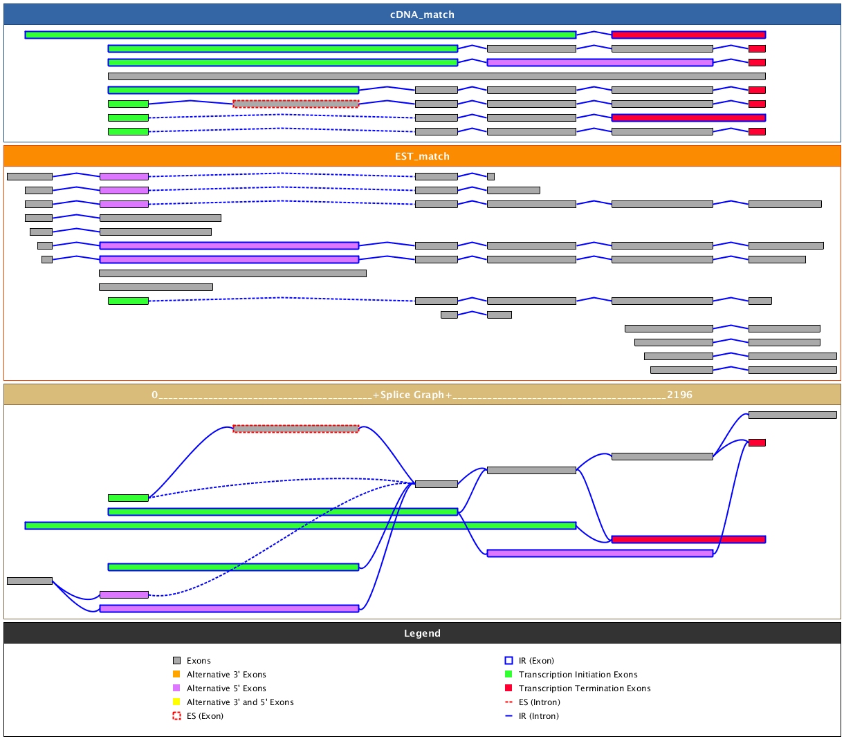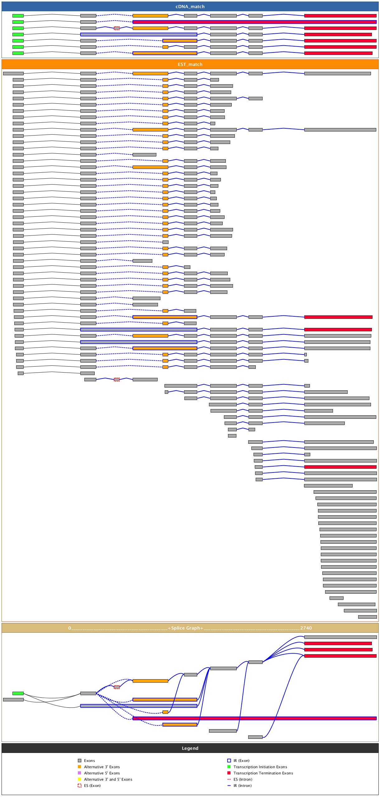 | AS Cluster | Splice Graph | # ESTs | # FL cDNA | # Exons | IR | SE | 3' | 5' | B |