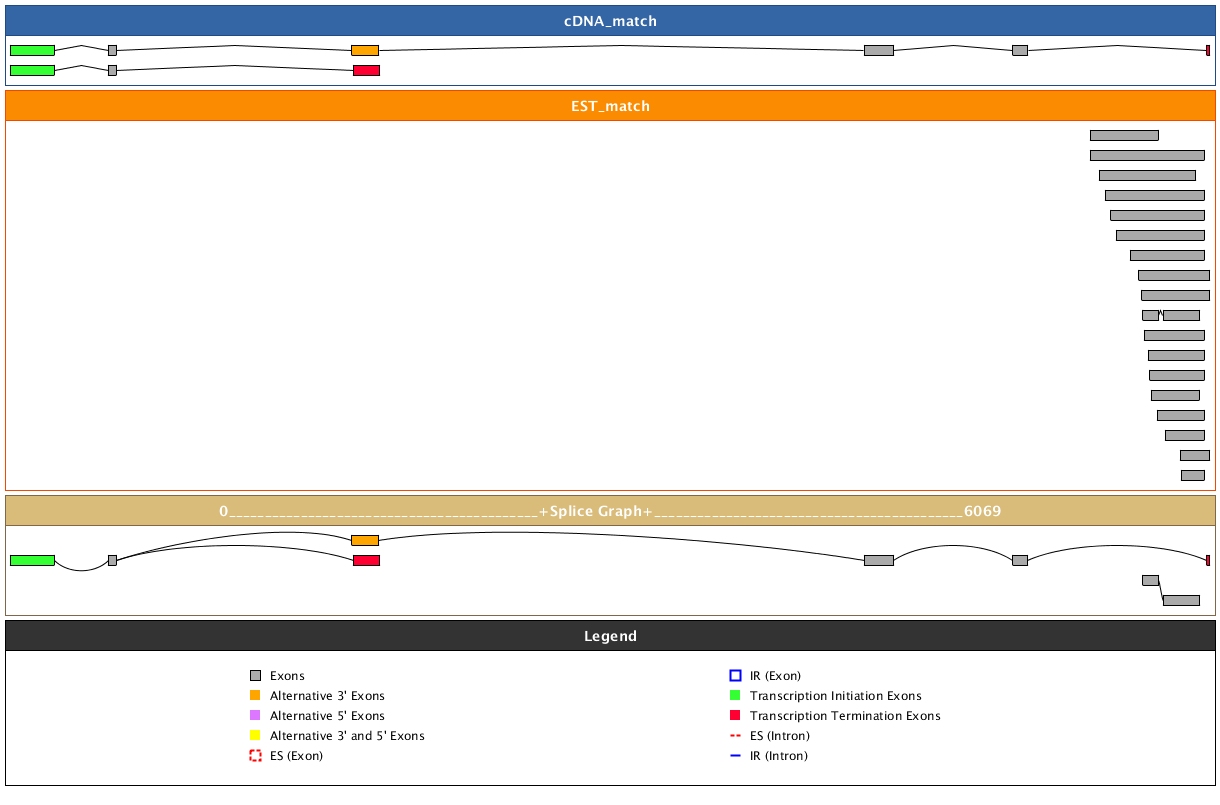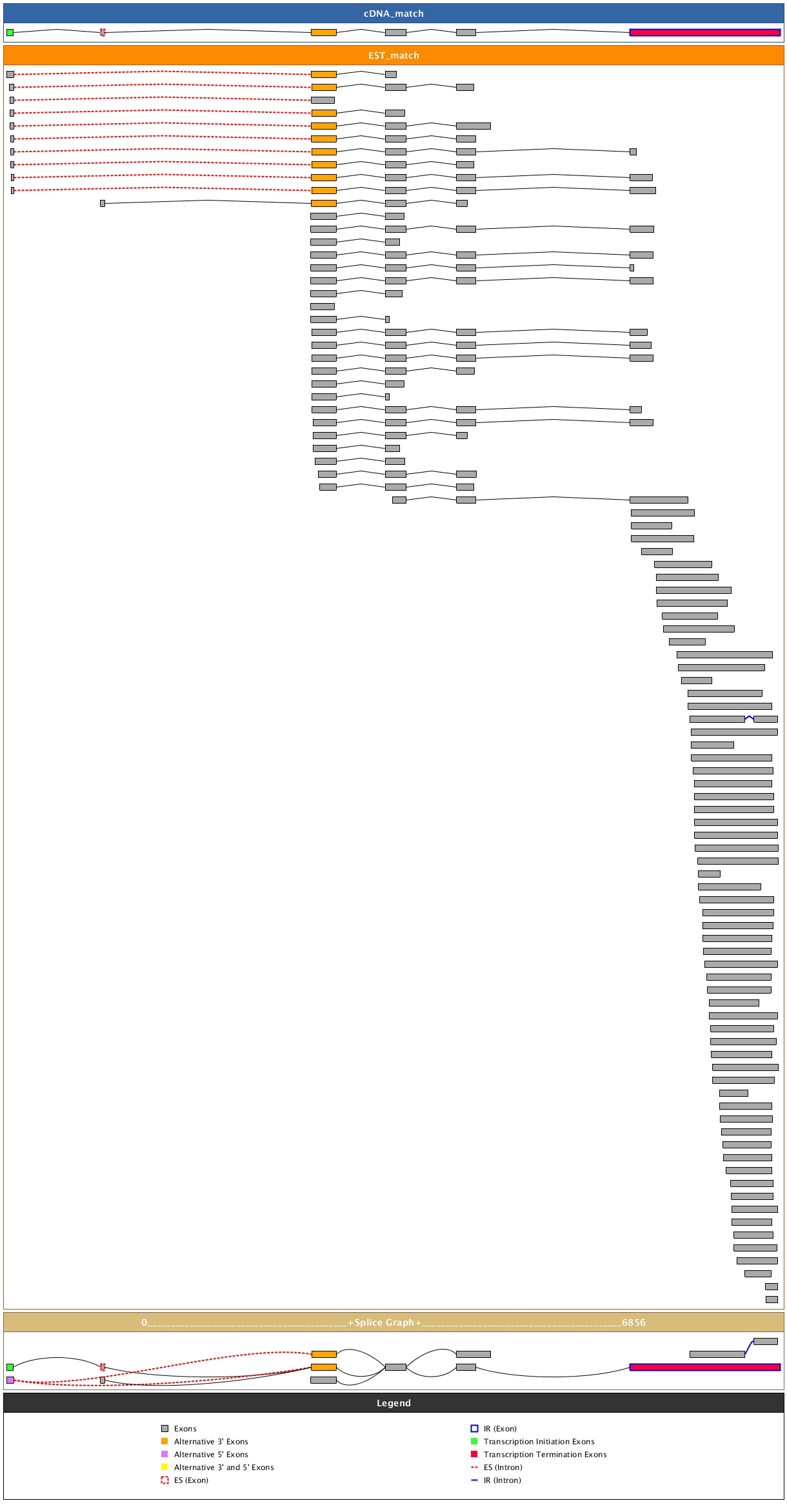 | AS Cluster | Splice Graph | # ESTs | # FL cDNA | # Exons | IR | SE | 3' | 5' | B |