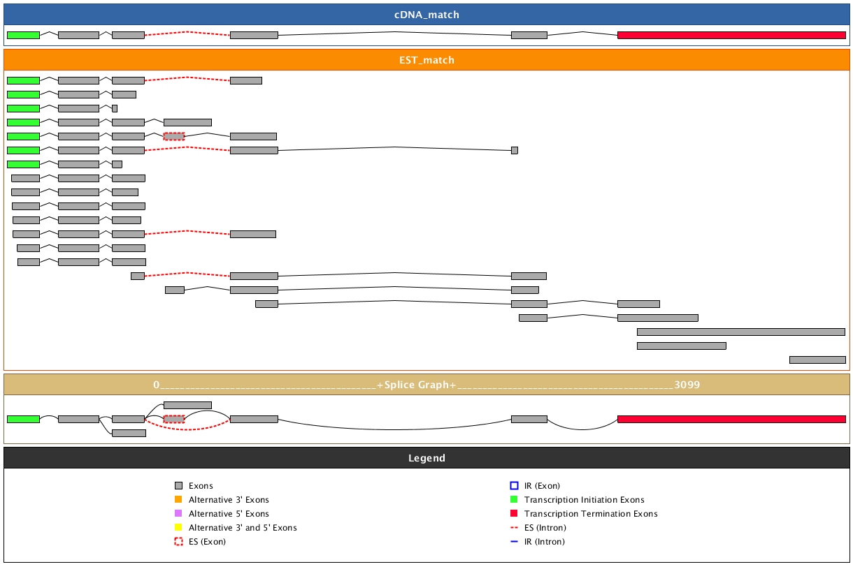 | AS Cluster | Splice Graph | # ESTs | # FL cDNA | # Exons | IR | SE | 3' | 5' | B |