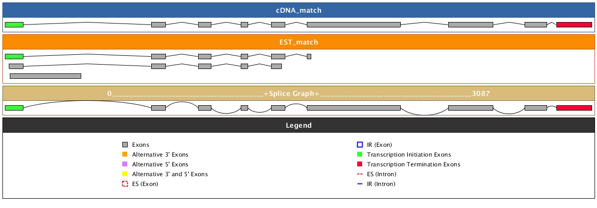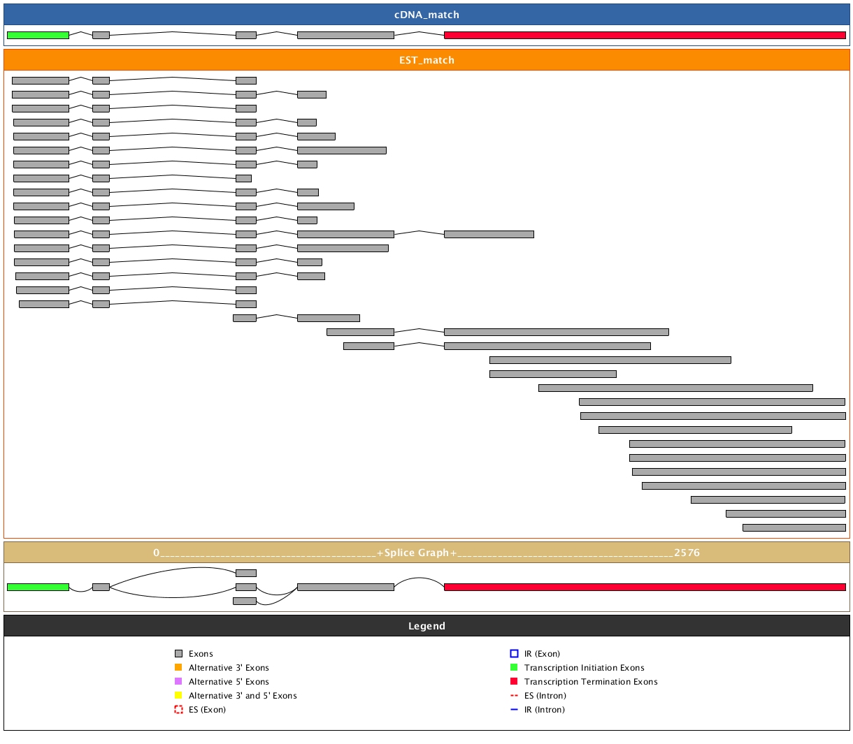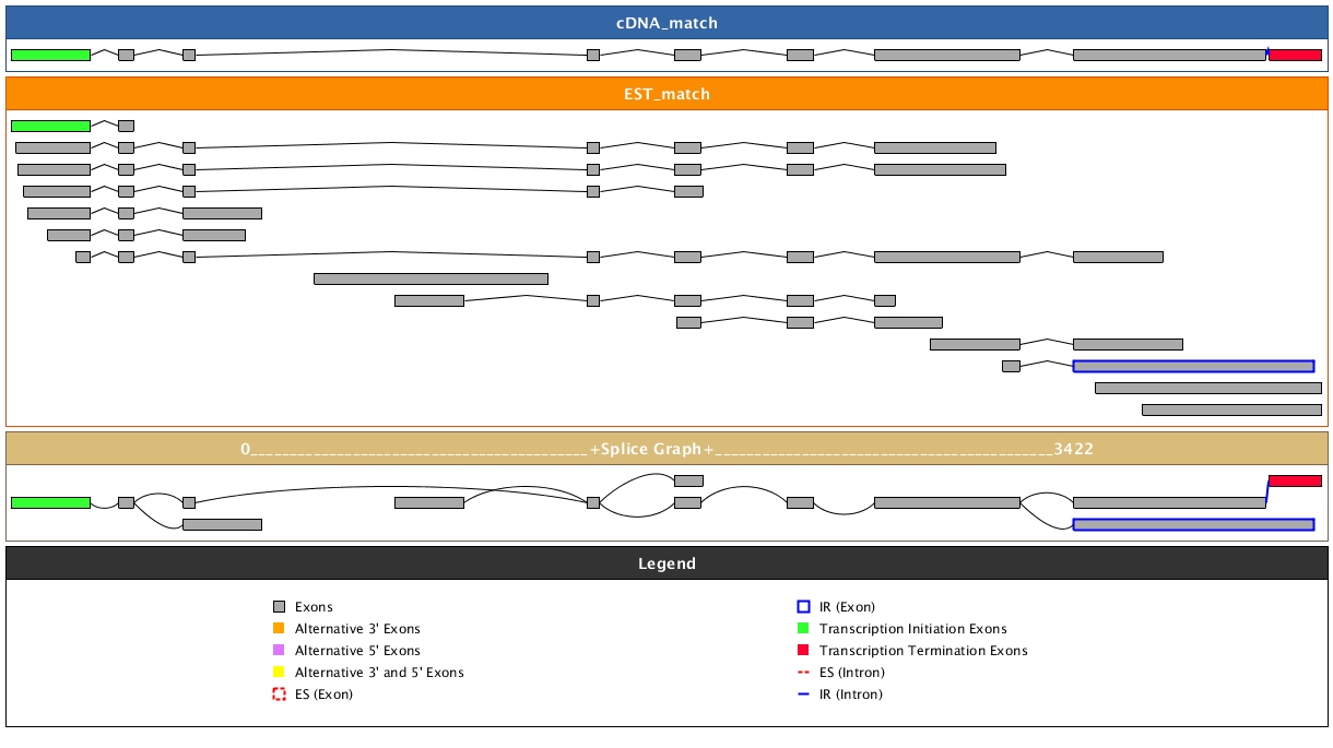 | AS Cluster | Splice Graph | # ESTs | # FL cDNA | # Exons | IR | SE | 3' | 5' | B |