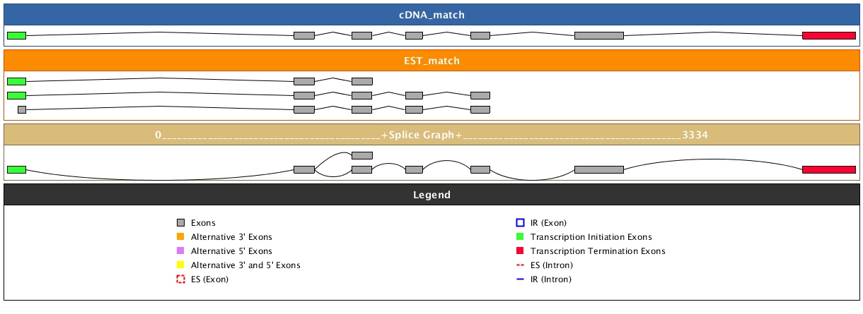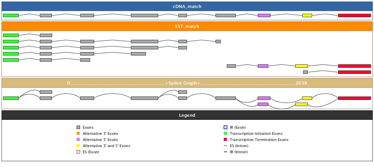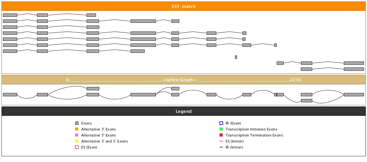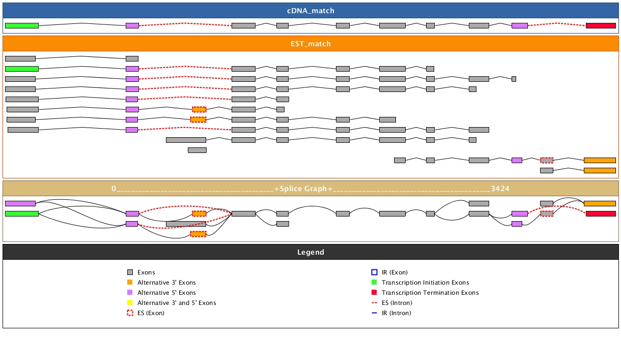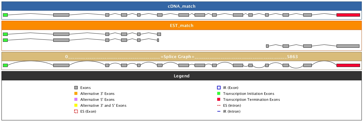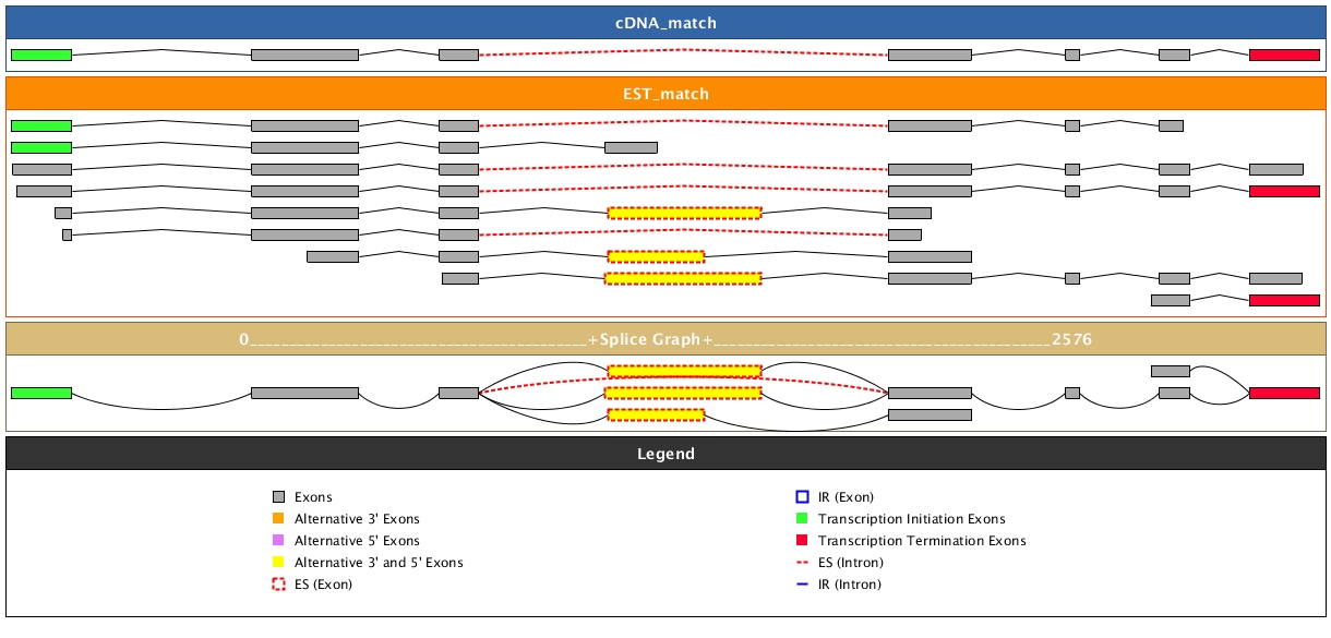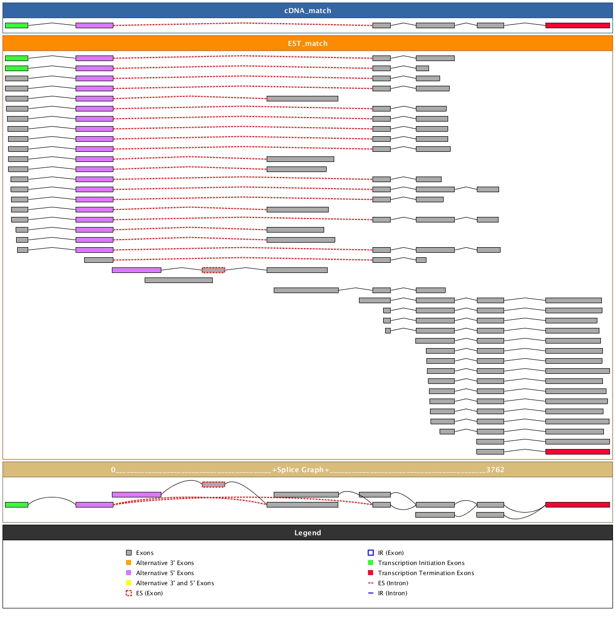 | AS Cluster | Splice Graph | # ESTs | # FL cDNA | # Exons | IR | SE | 3' | 5' | B |